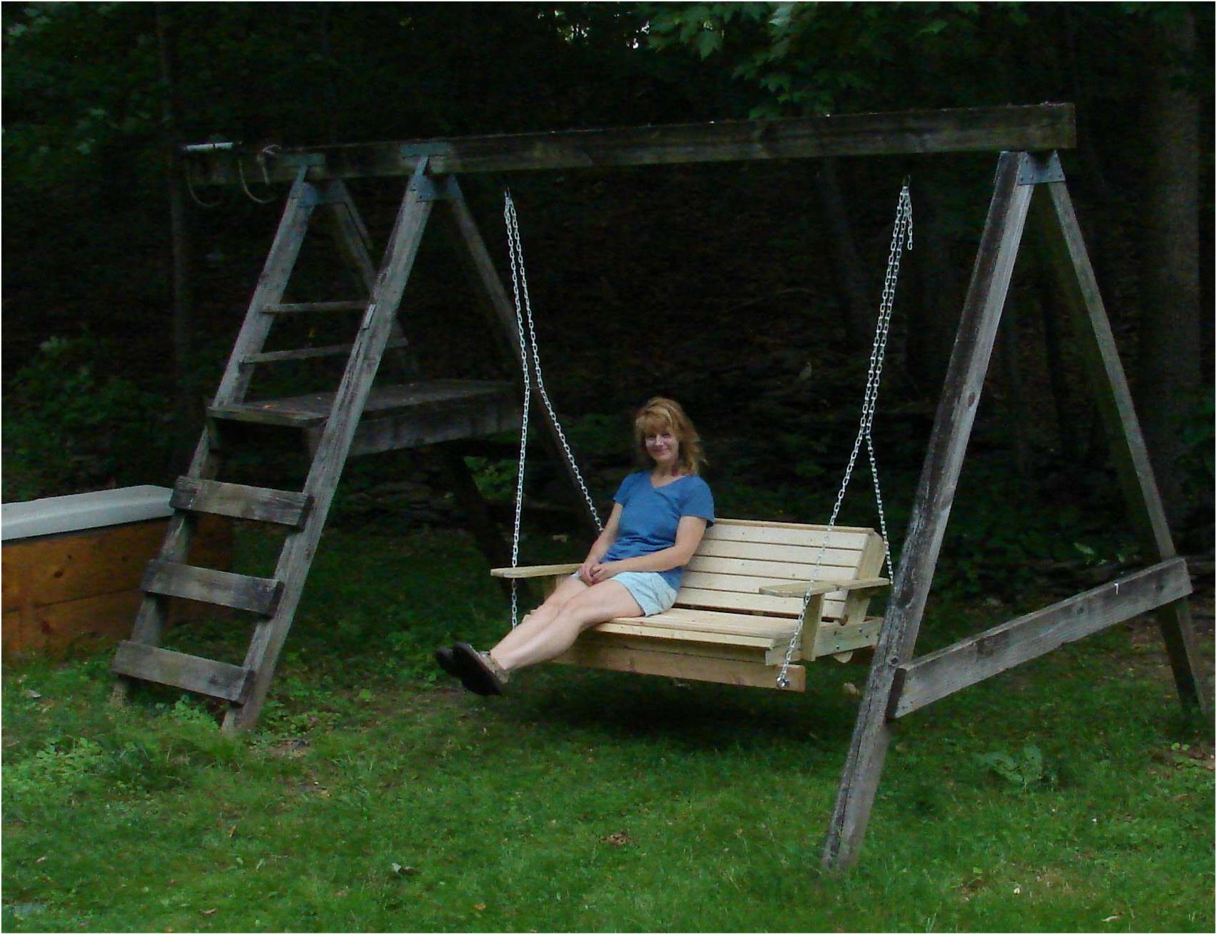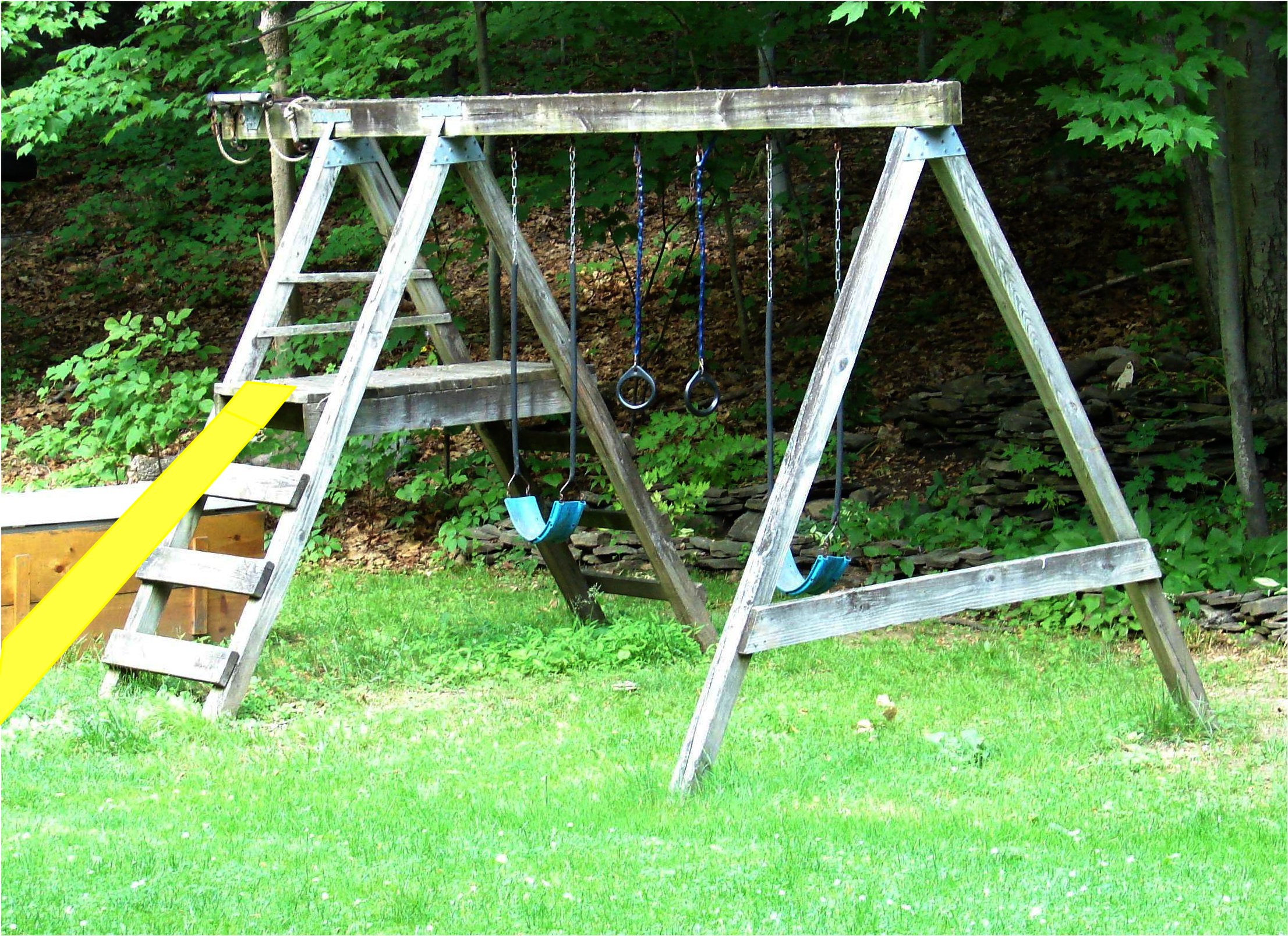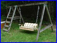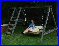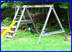 Well, its been some 14 years since I built this swingset for my then 2 and 4 year old. It was made from pressure-treated 4x4's, 4x6's, 2x6's; pretty heavy duty stuff. Not being one to throw away something that is perfectly good, I'm now stuck with what to do with this thing. It's still in perfect shape, but noone in the house to use it. |