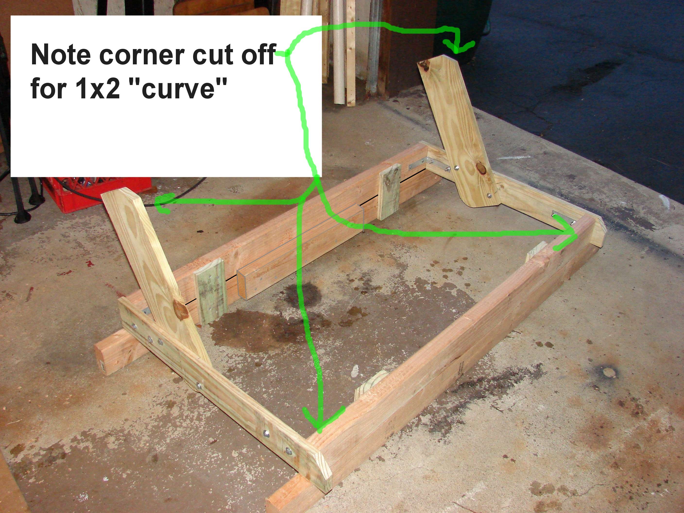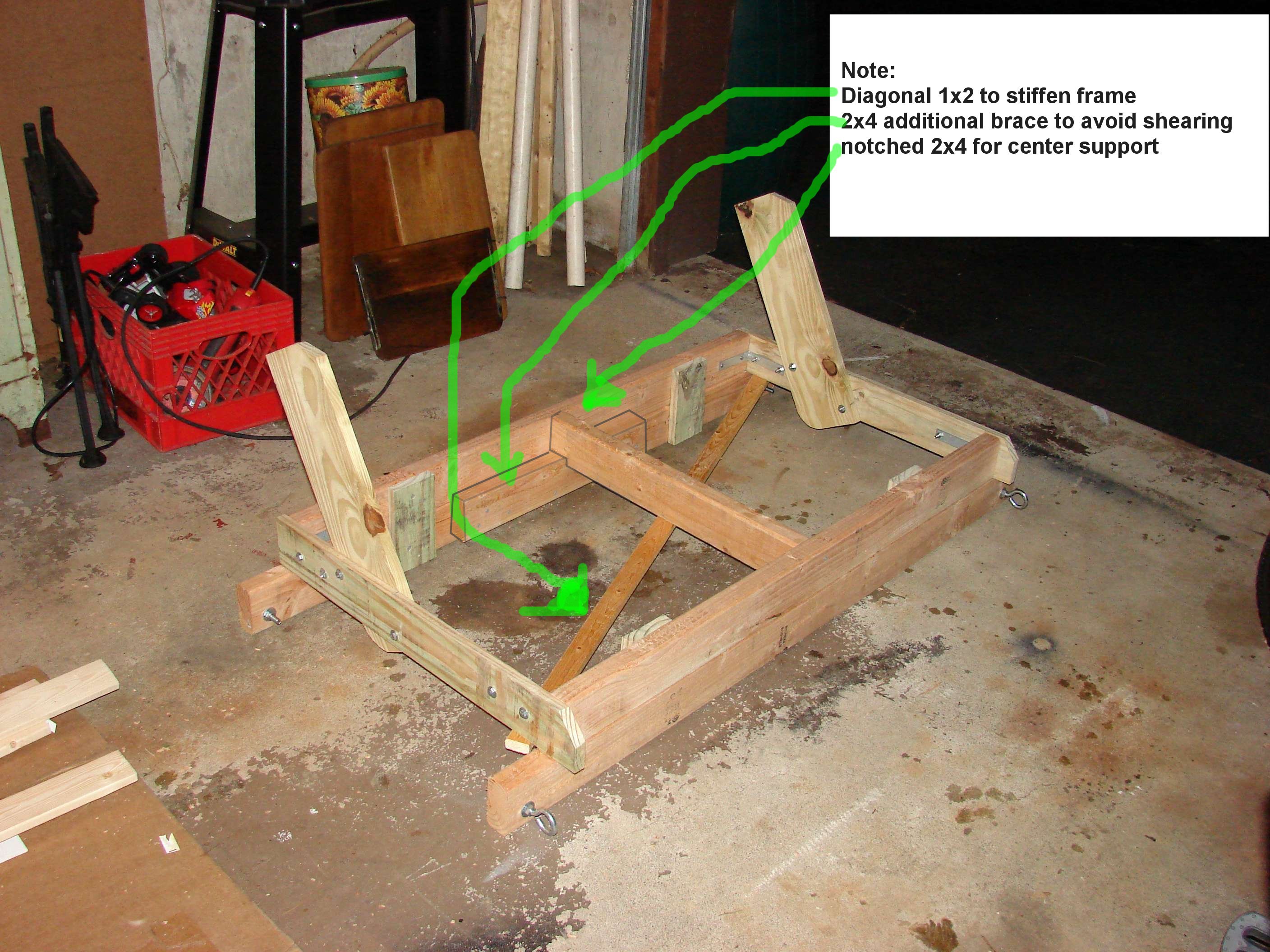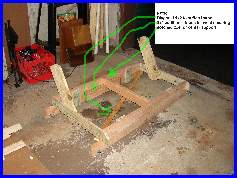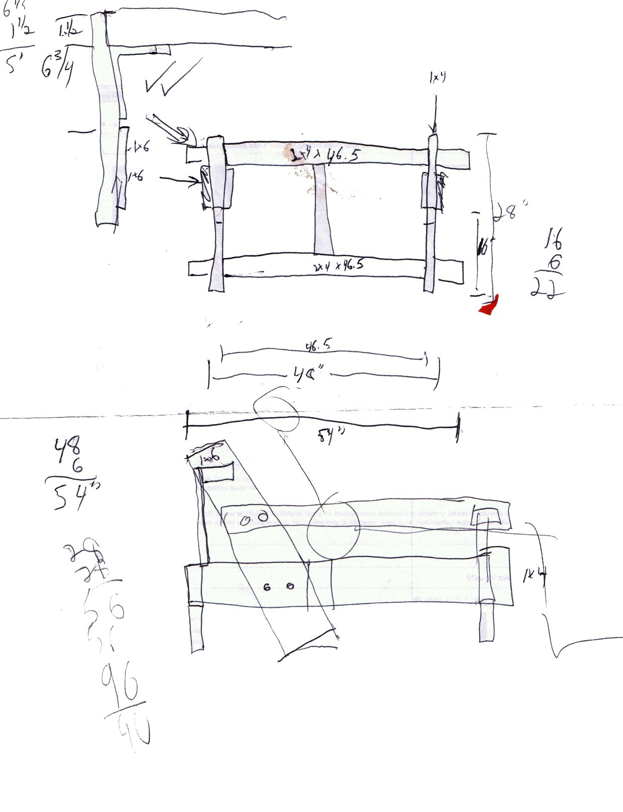 Please take those hand written plans with a grain of salt; there's a reason there 3 versions. I changed and played with the numbers and layout until I got it like I wanted. Most notibly you notice I switched the backrest riser from the outside of the frame to the inside; this changes things if you make your own adjustments. I also took into consideration the real dimensions of 2x4's and 1x4" (