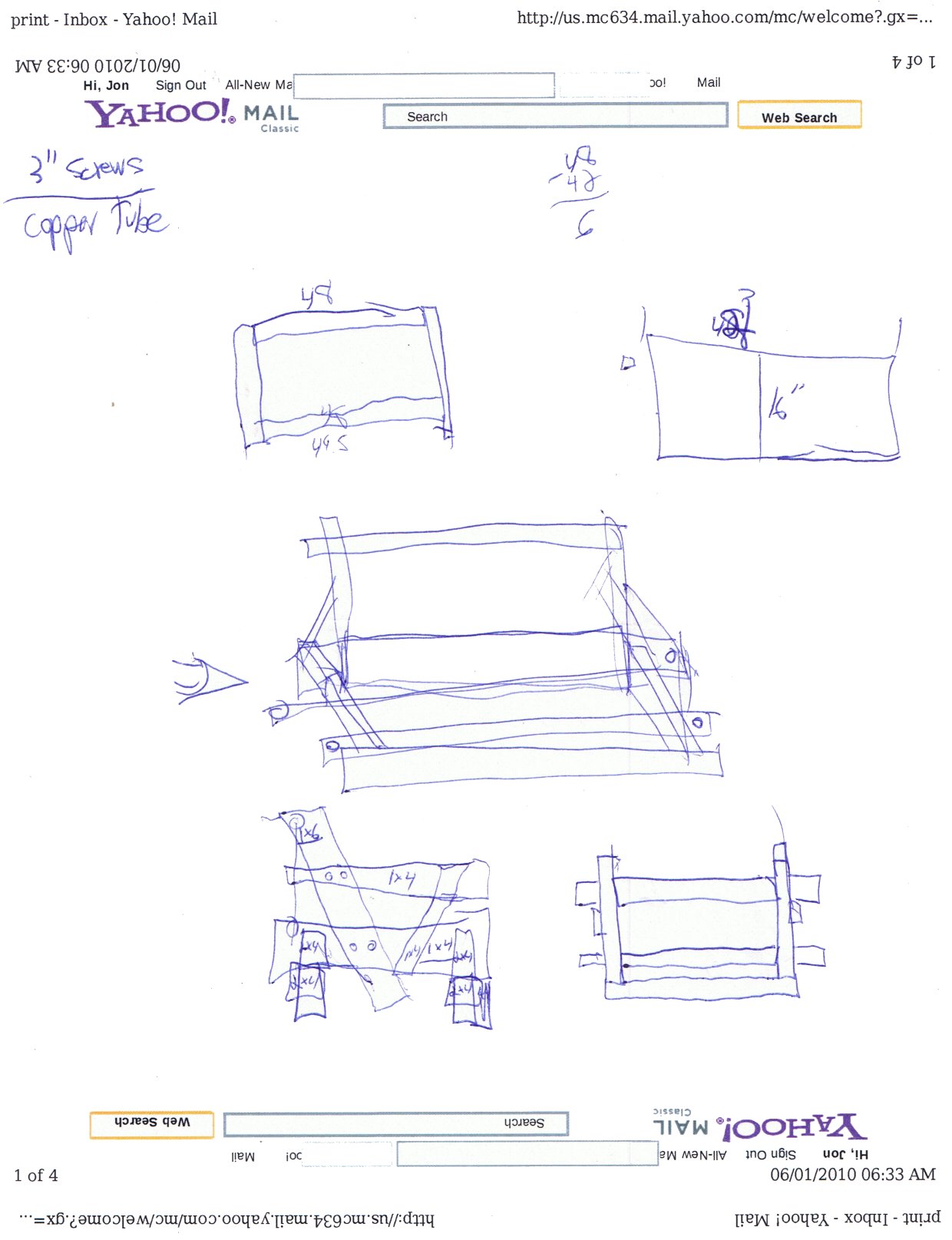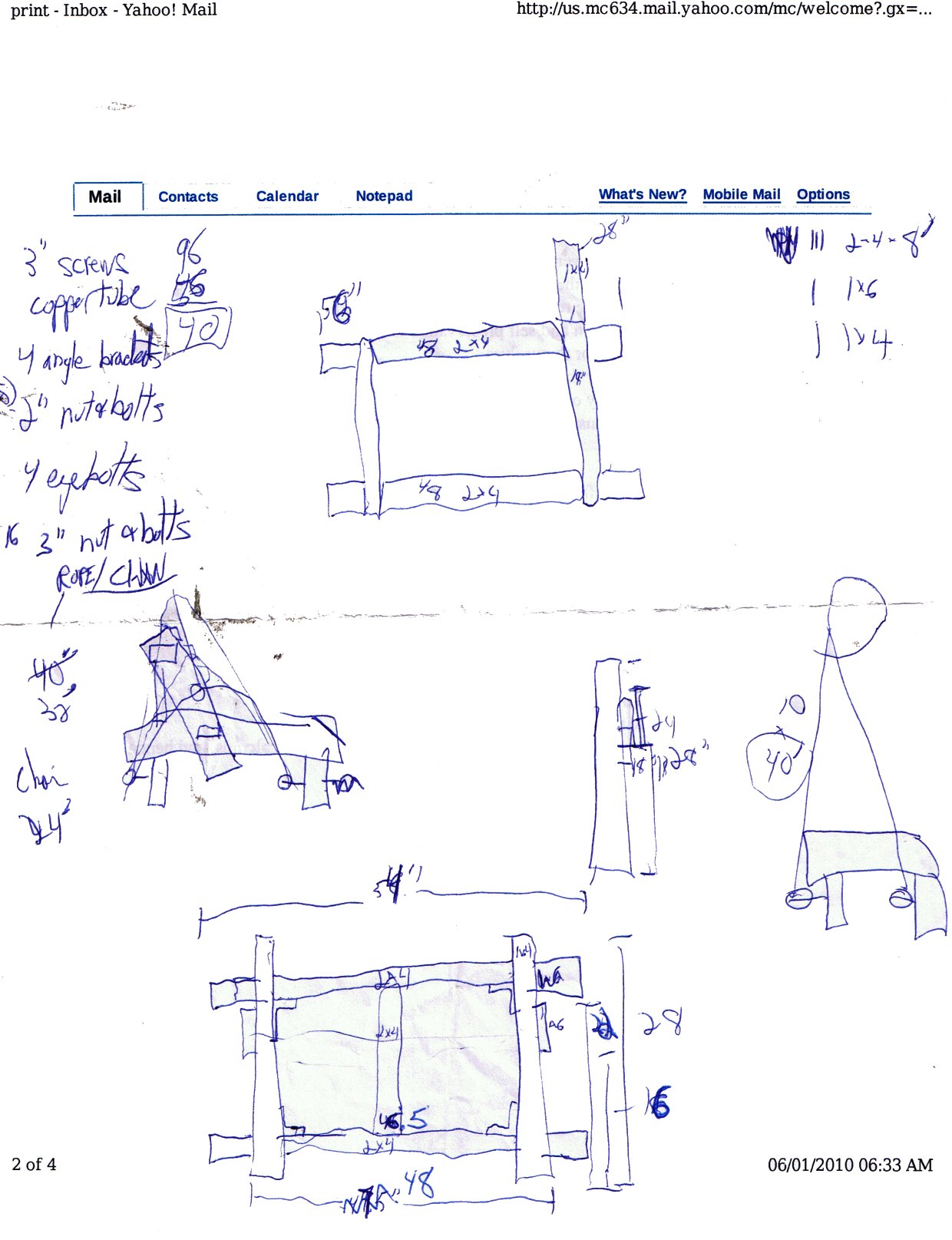 | Well, the Mrs suggested turning it into a hanging bench for two. And this is that project. So over breakfast coffee with pen and paper, I drew up these plans: |