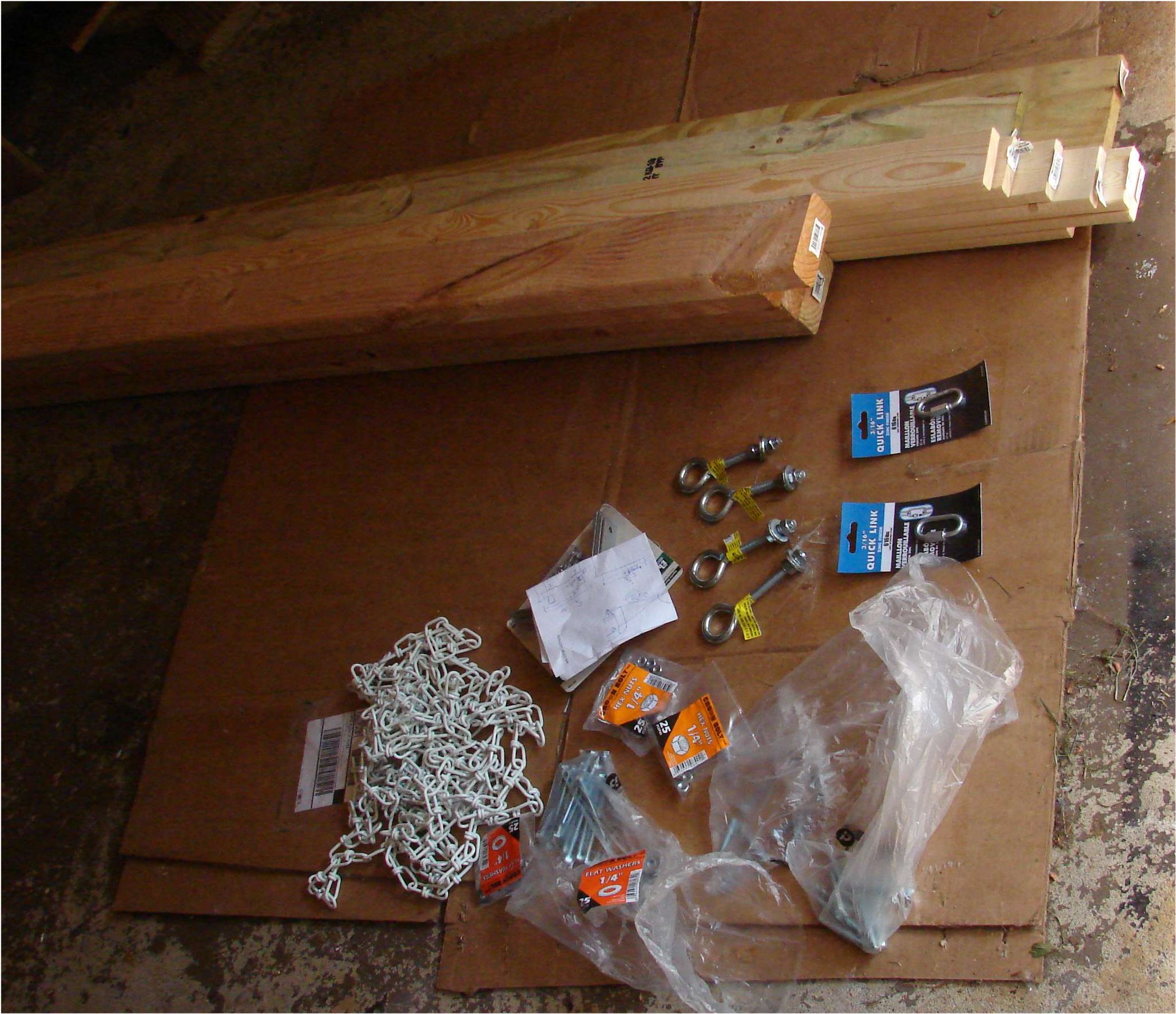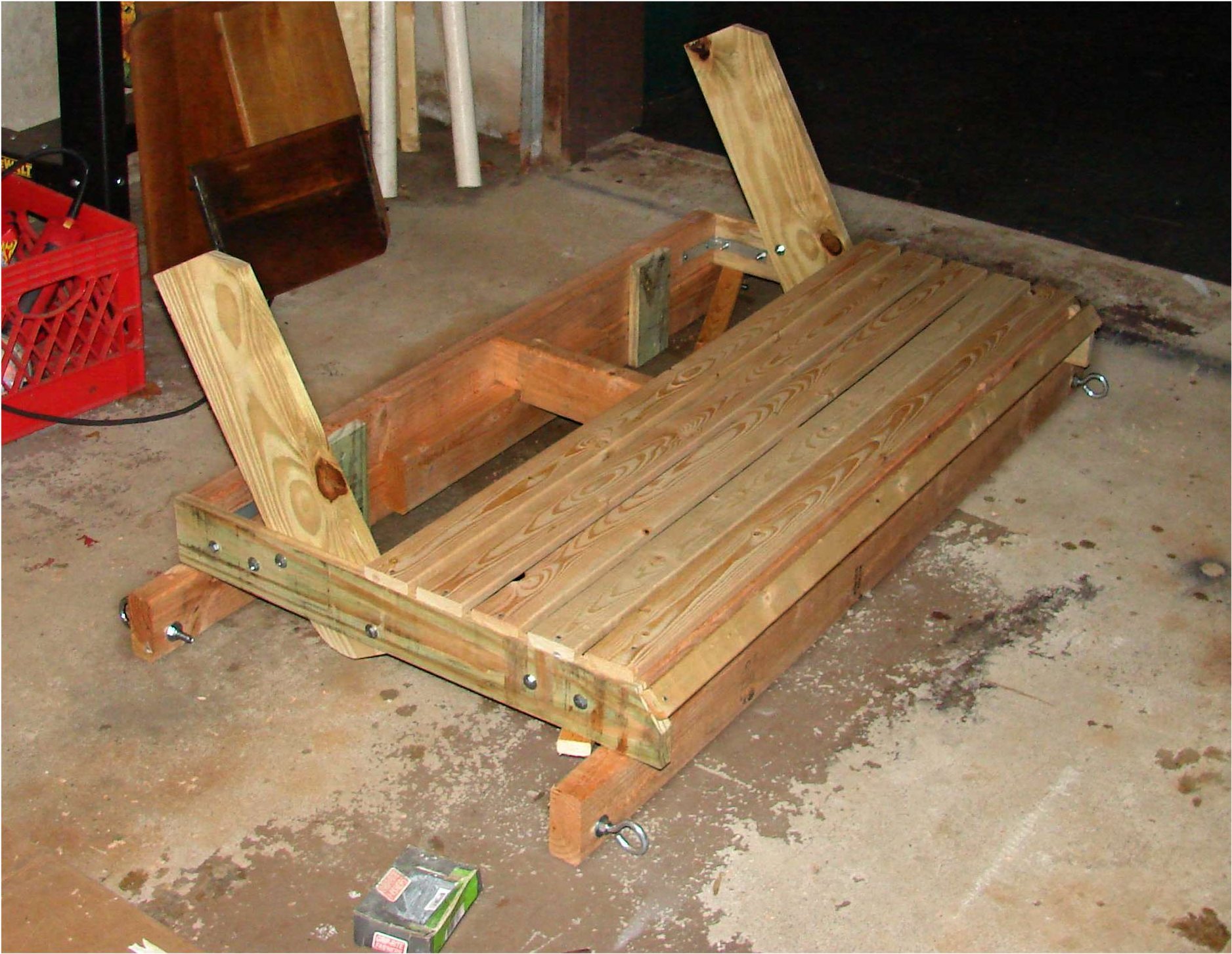 1.5x3.5, and .75x3.5) to get my bench width to exactly 48" (mostly so the 1x3's could split in half to get 2 planks per 8 footer with no waste) Well so off I go with a list of stuff to get at the home depot. here's the BOM that I actually used: BOM: count part ---------------- 3 2x4x8' 6 1x3x8' 2 1x2x8' 1 1x4x8' 1 1x6x8' 4 3/8x4" eye bolts 8 3/8 washers 8 3/8 nuts 4 4" right angle irons 8 1/4 x 1 1/2" hex bolt 4 1/4 x 2" hex bolt 1 bag of 1/4" nuts 1 bag of 1/4" flat washers 25 feet of 255lb rated chain 2 "S" hooks 2 3/16 Quick Links (616lb rated) and from home stock: 1 5/8", 3", and 3 1/2" deck screws, 1 1/2" deck nails (with the twist in it.) total cost: around $70 not counting stain and finishing plus about 6 hours assembly time: |