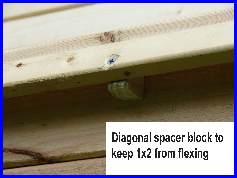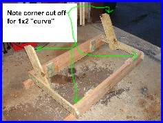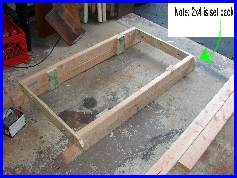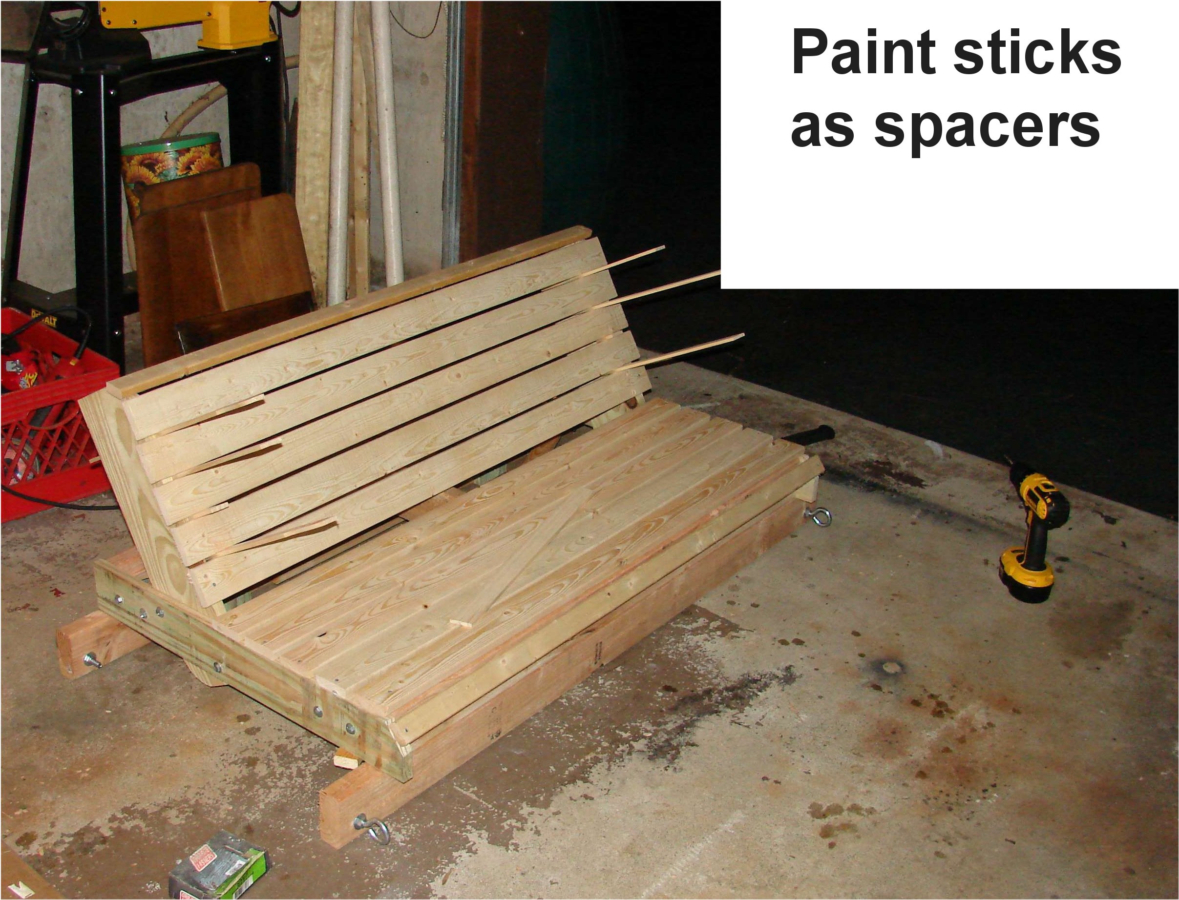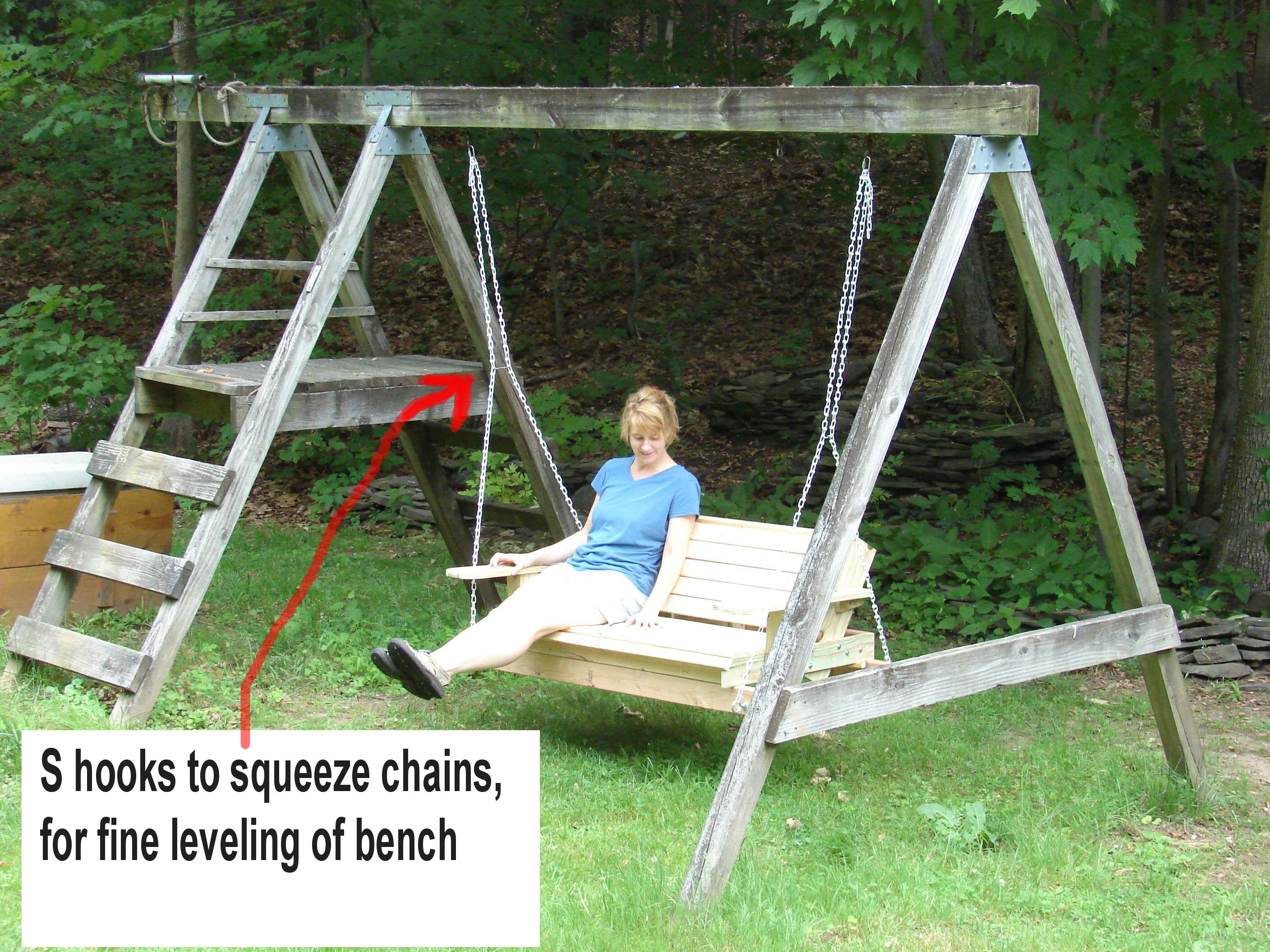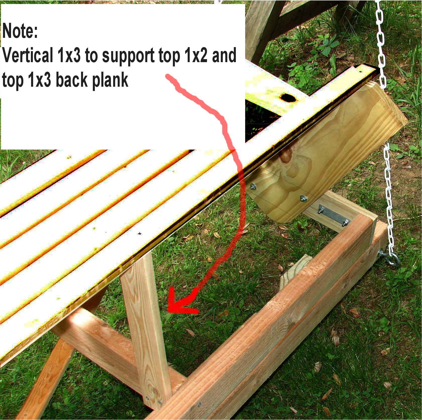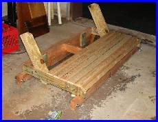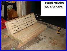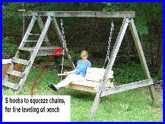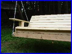 The build was pretty straight forward. The 3/8 eye hooks were openned up just enough to let the chain slip in, and the open end was locked down so the chain wouldn't come off. the 2 quick links were used at the top to join the two chains on each side. The chain was cut into 4 even lenghths. The unusual part is in the putting together of the 2 2x4's to make a 2x8. the bottom 2x4's being the support for the whole bench. I use the scrap pieces of the 1x4 and 2x4's to attach them to the bottom frame of the bench. Note the 2x4 scrap is raised about a 1/2" so the bench frame can't slip off the supports. This created the need to notch the center support. The picture just before the planking is started shows this best. |
