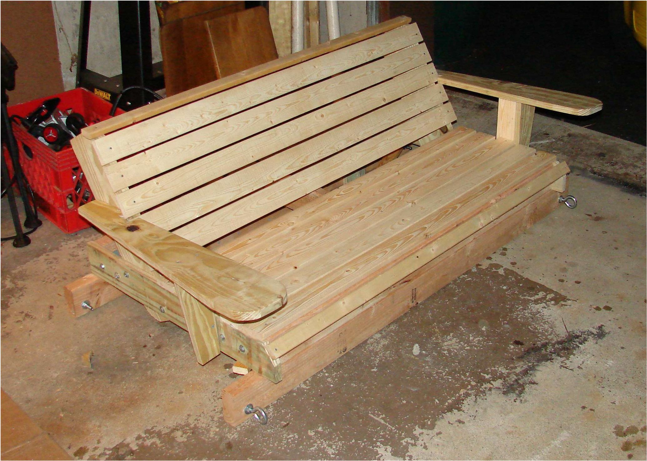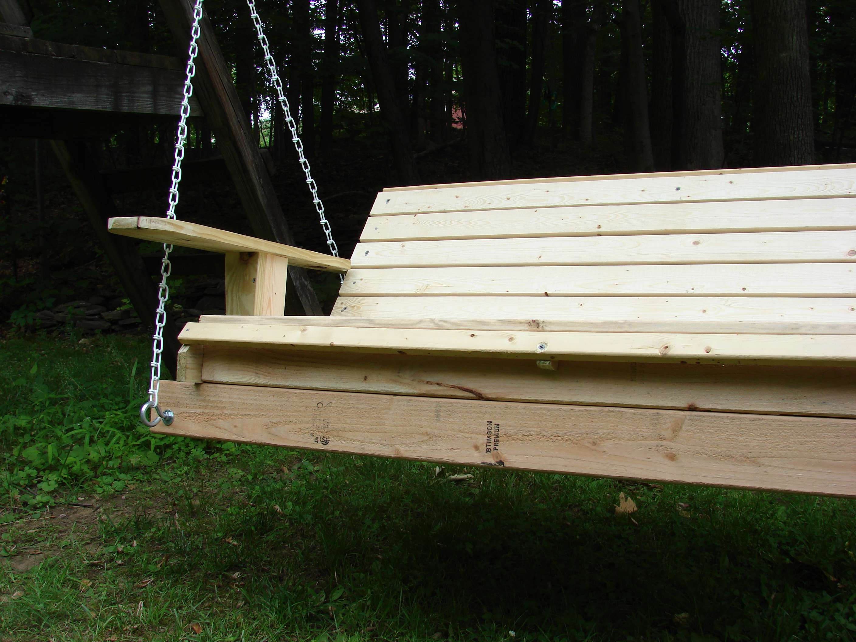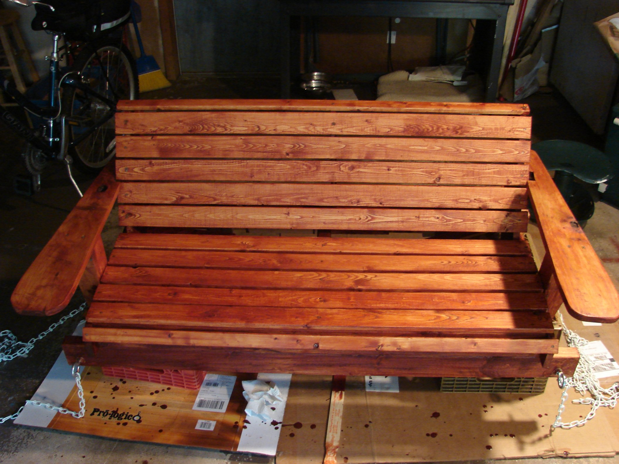 The seating area is 16x48" and the backrest is 15" tall in this version. If I had to do it again, I think I'd raise the backrest a lot more, although this version the backrest top is a perfect height for elbows. The support 2x4's are 54" long, and I was able to get away with this as the swing attachments were farther out. Even still the chain rubs the armrests, I would make these supports longer next time so the chain is completely free of the armrests. The armrests were made from the leftover piece of 1x6 that made up the back. I Just winged it with a pencil to what I wanted, cut it out on my band saw, notched out where it needed to be to get around the planking. Well, its about to start to rain, so we will have to move indoors for staining. The can says to use a brush, but I like to use a rag and rub the stain into the finish. I think it comes out nicer that way: |